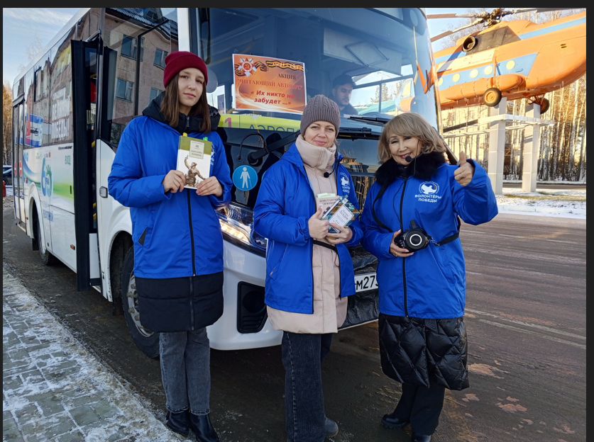 В Белоярском организаторы Акции "Читающий автобус "Победа помнит Героев"» вместе сволонтерами собрались у мемориала в Сквере Победы, чтобы почтить память героев войны. Ониоткрыли Акцию словами: «Сегодня наша страна отмечает государственный праздник - День народного единства и день воинской славы России. Поздравляем всех с этим праздником» и прочитали стихи о Великой Отечественной войне, а затем в зале ожидания автовокзала включили для пассажиров цифровой аудиоролик с декламацией художественного чтения отрывков из произведений авторов-фронтовиков победителями и призерами Цифрового литературно-художественного конкурса чтецов, проведенного АНО «ЦТЭД» совместно с Государственной библиотекой Югры.