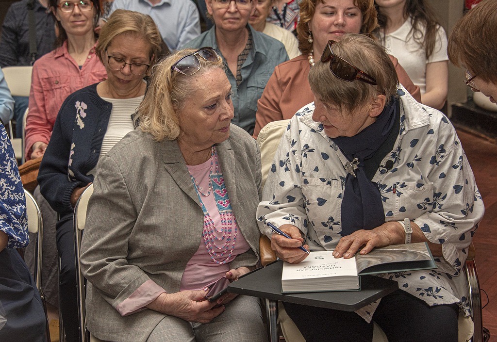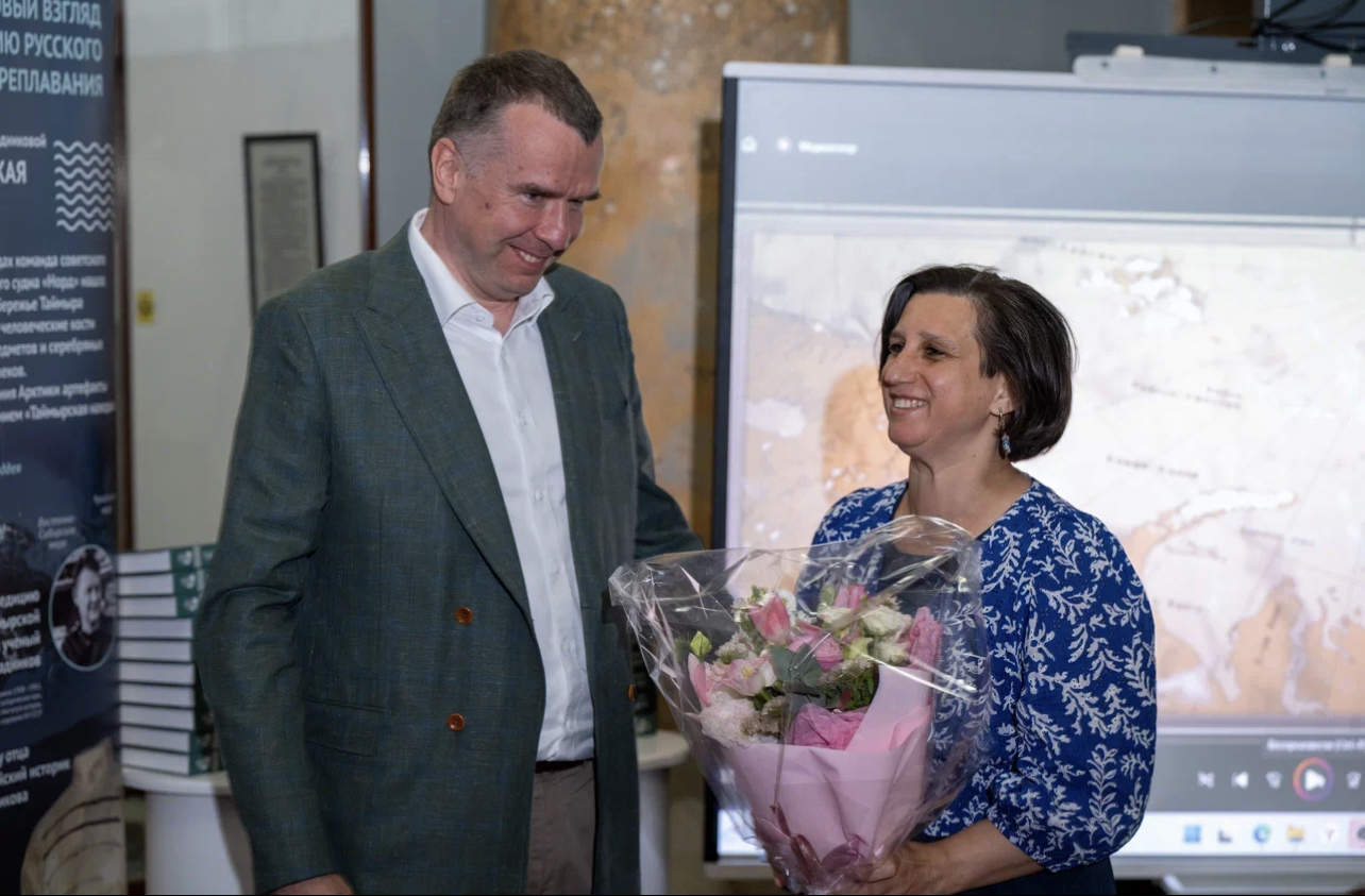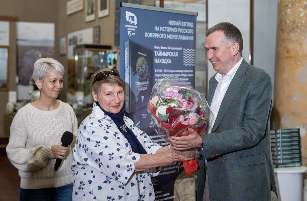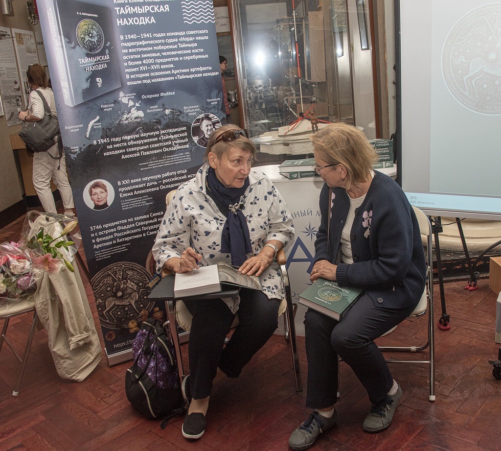 Завершилась презентация показом отрывка из документального фильма Леонида Круглова «В Арктику» (он был снят в ходе комплексной экспедиции 2020 года) и большой автограф-сессией: Елена Окладникова подписала книги на память всем желающим, в том числе и Герасимовой Диане Васильевне.